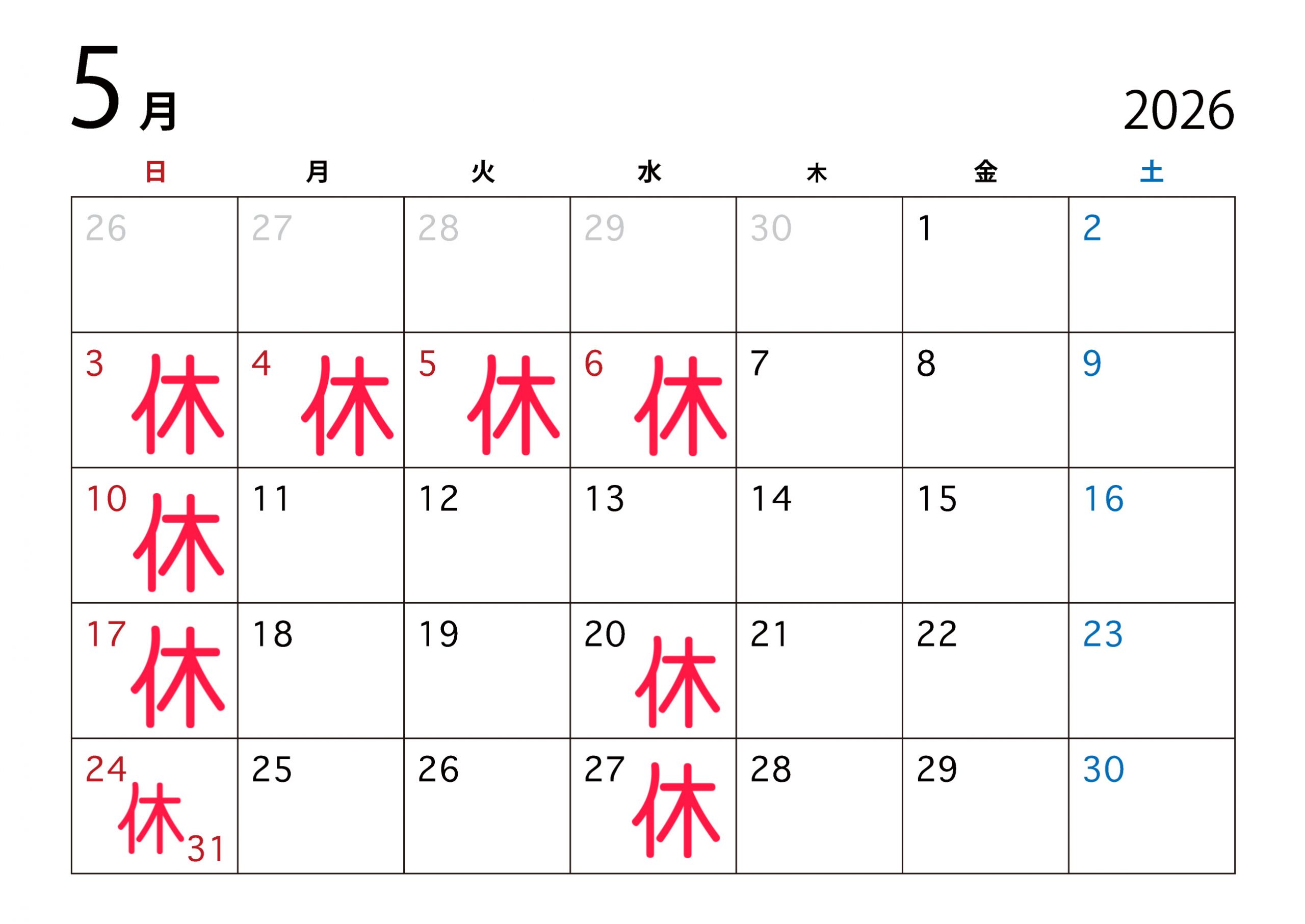2026.04.165月の診療日カレンダーです